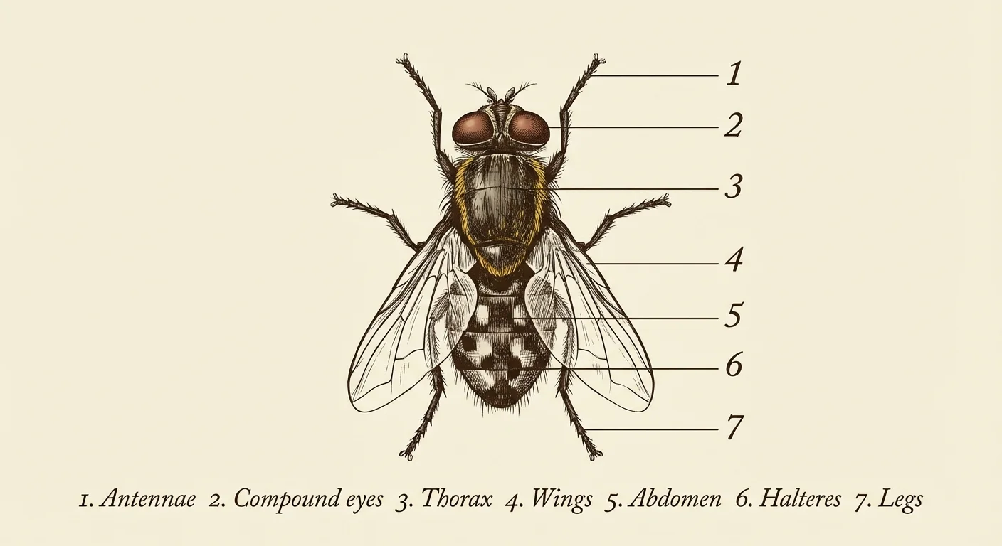 • Les mouches domestiques sont plus petites, plus agiles et tiennent leurs ailes en angle (non chevauchantes). Elles se reproduisent dans la saleté.