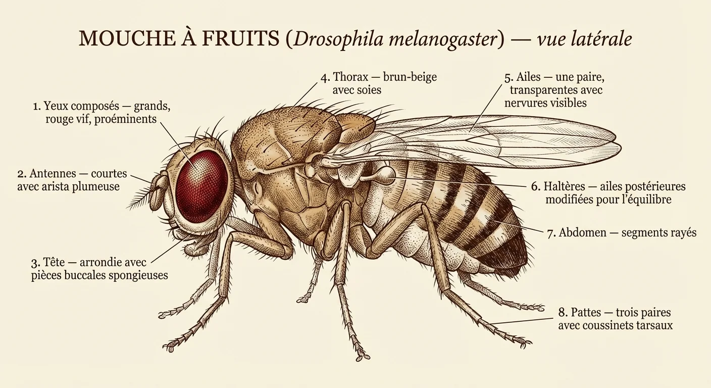 Le cycle de vie complet de l'œuf à l'adulte ne prend que 8-10 jours à température ambiante—parmi les insectes à reproduction la plus rapide. Les femelles pondent jusqu'à 500 œufs à la fois près de matière organique en fermentation. Les œufs éclosent en 24-30 heures en minuscules larves qui se nourrissent pendant 5-6 jours avant de se nymphoser. Cette reproduction rapide permet aux populations de proliférer en quelques jours.